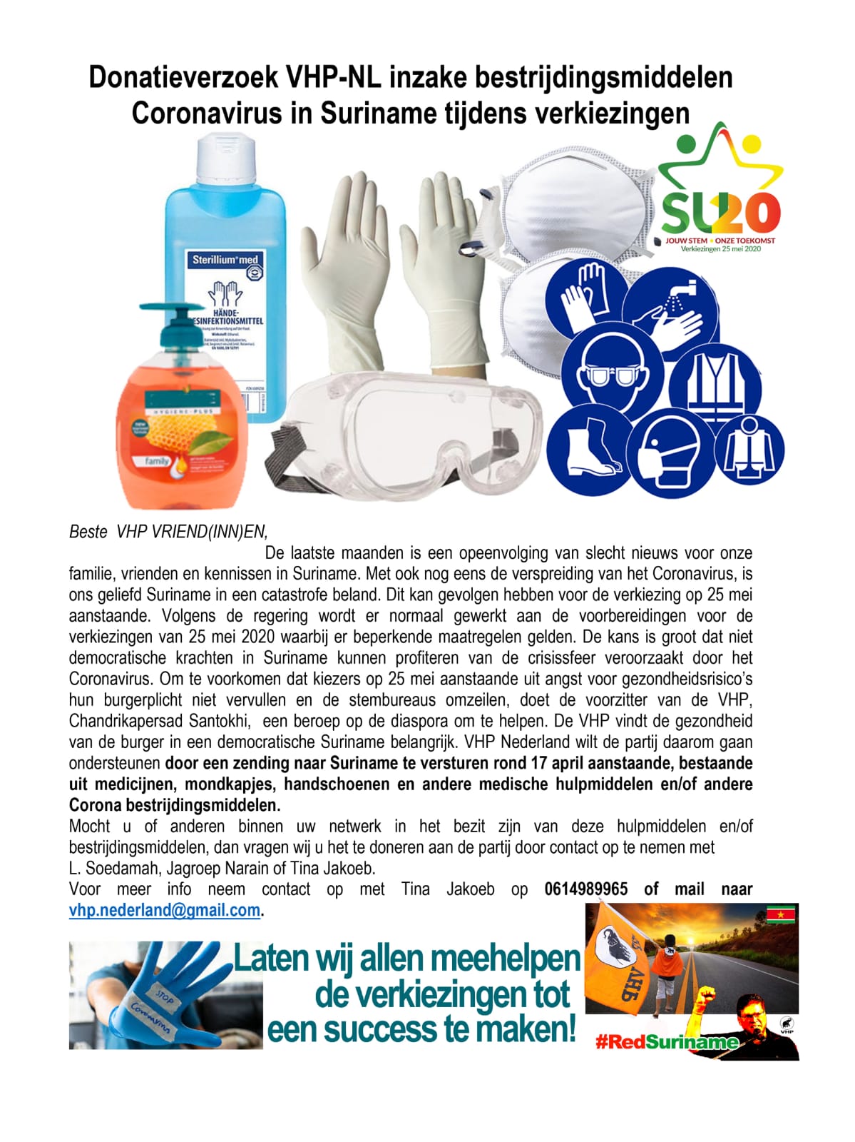 Donatieverzoek VHP-NL inzake bestrijdingsmiddelen Coronavirus in Suriname tijdens verkiezingen