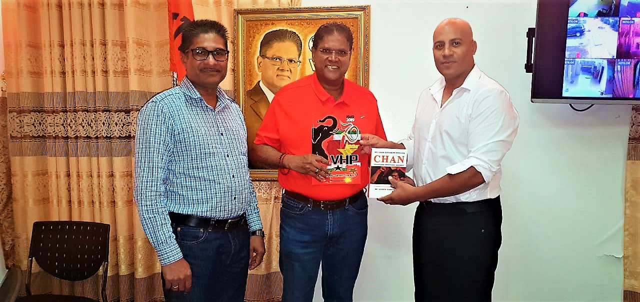 VHP voorzitter Chan Santokhi bedankte de heer Rodney Bouterse dat hij bereid is de VHP te ondersteunen en Suriname te helpen redden. Uit handen van de VHP voorzitter mocht de heer Rodney Bouterse, een exemplaar van het boek “Chan” in ontvangst nemen.