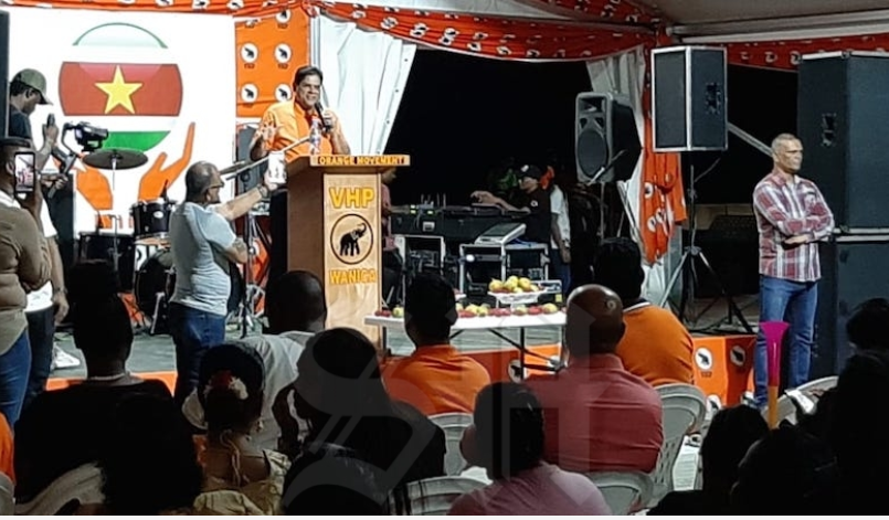 Het verkiezingsprogramma van de partij is volgens Santokhi op basis van wat uit het veld is vernomen, opgesteld. “Dit is gemaakt naar aanleiding van wat het volk aan verandering wil zien, terwijl de NDP in grote groepen loopt in de buurten om vlaggen te planten voor de mensen hun deuren. Wat de NDP niet weet is dat de paarse vlag een vlag is van wanhoop, koersstijging, stijging van de criminaliteit en werkloosheid”, zei de voorzitter van de oranjepartij.
