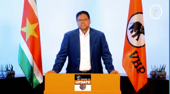 Voorzitter van de VHP Chan Santokhi met een Covid-19 update naar aanleiding van de laatste positief geteste gevallen in Suriname.
